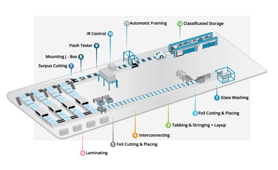 This machine assembles and welds the photovoltaic cells together. Tabber connects ribbon on cells whereas the stringer connects one cell to another.